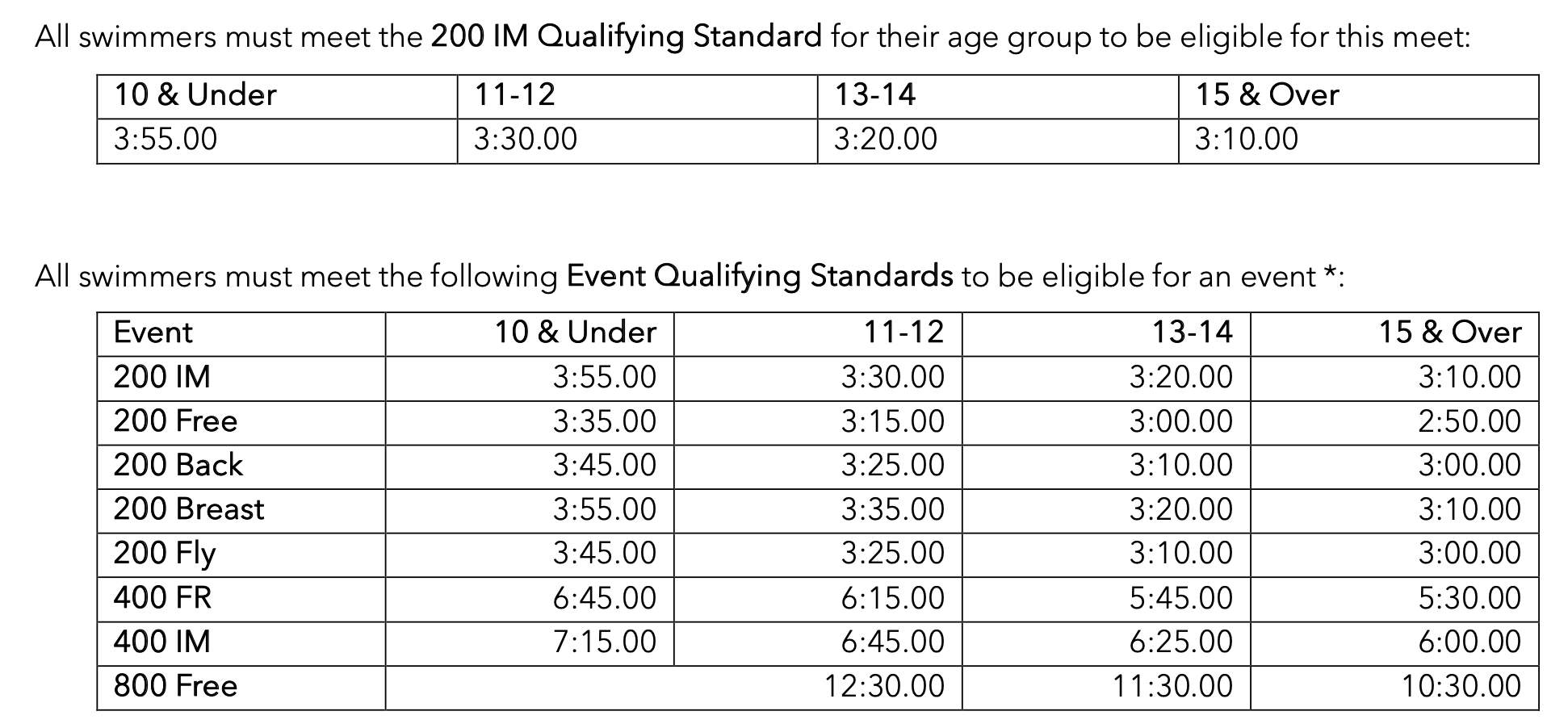 All swimmers must meet the 200 IM qualifying standard for their age group