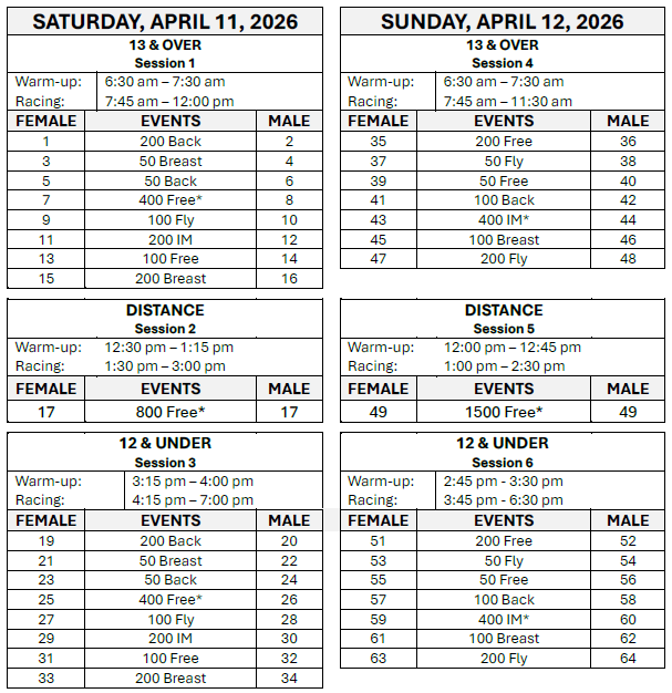 What Swimmers: Registered competitive swimmers. Age determined as of April 11, 2026. 12 & Under and 13 & Over age groups. 800 Free and 1500 Free are Open Age Group & Mixed Gender. Meet limited to 350 swimmers.